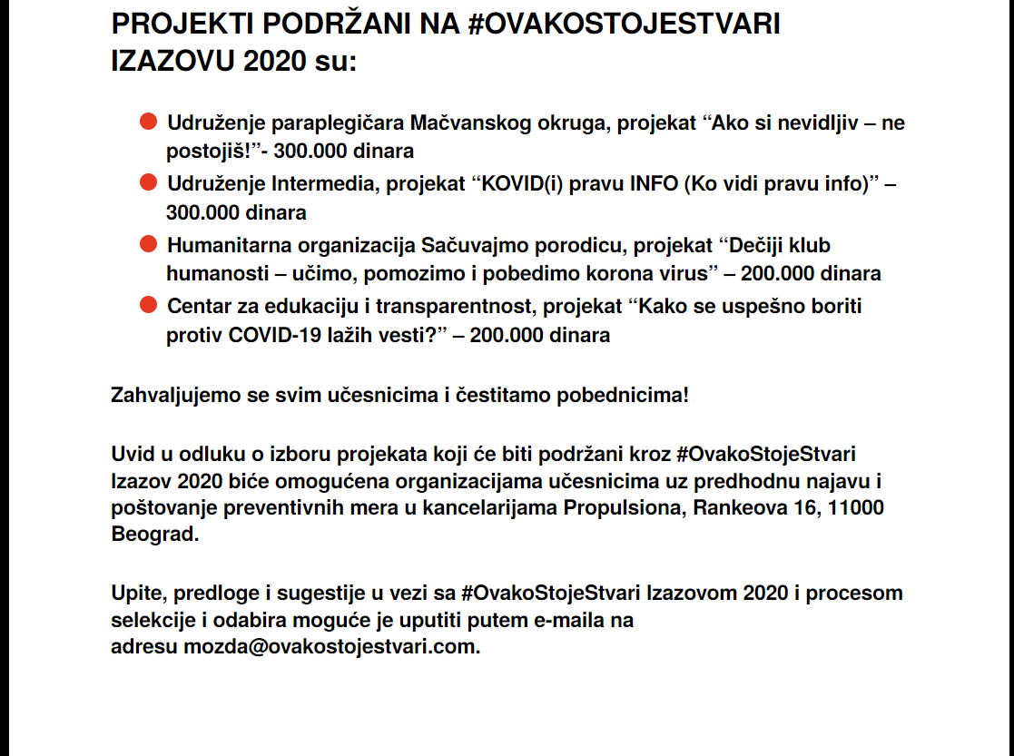 U okviru obeležavanje globalne Nedelje medijske i informacione pismenosti 2020. godine, kampanja #OvakoStojeStvari je početkom oktobra raspisala izazov za sve neprofitne organizacije i medije (van Beograda) da predlože lokalne aktivnosti i obrade temu iz ugla odbrane od poplave informacija o pandemiji. Na konkurs je ispred i u ime Udruženja paraplegičara mačvanskog okruga član udruženja kokurisao ličnim projektom pod nazivim „Ako si nevudljiv-ne postojiš“, projekat je proglašen kao najbolji i na račun Udruženja paraplegičra je za realizaciju projektnih aktivnosti uplaćeno 300.000 dinara.