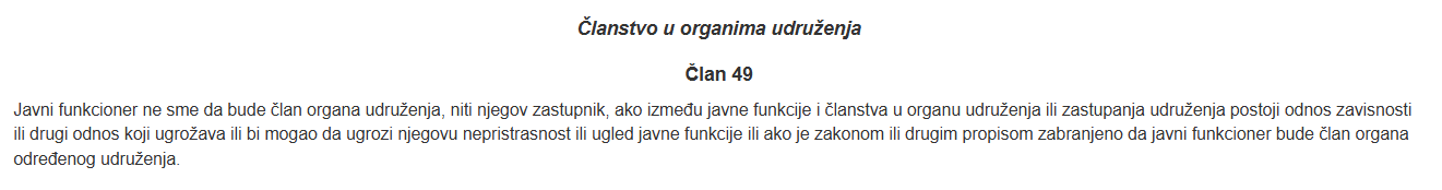 dolazimo do krivičnog dela korupcije, odnosno, sukoba interesa gde je u Zakonu o sprečavanju korupcije dela sukoba interesa u članu 49, piše da „Javni funkcioner ne sme da bude član organa udruženja, niti njegov zastupnik, ako između javne funkcije i članstva u organu udruženja ili zastupanja udruženja postoji odnos zavisnosti ili drugi odnos koji ugrožava ili bi mogao da ugrozi njegovu nepristrasnost ili ugled javne funkcije ili ako je zakonom ili drugim propisom zabranjeno da javni funkcioner bude član organa određenog udruženja.“