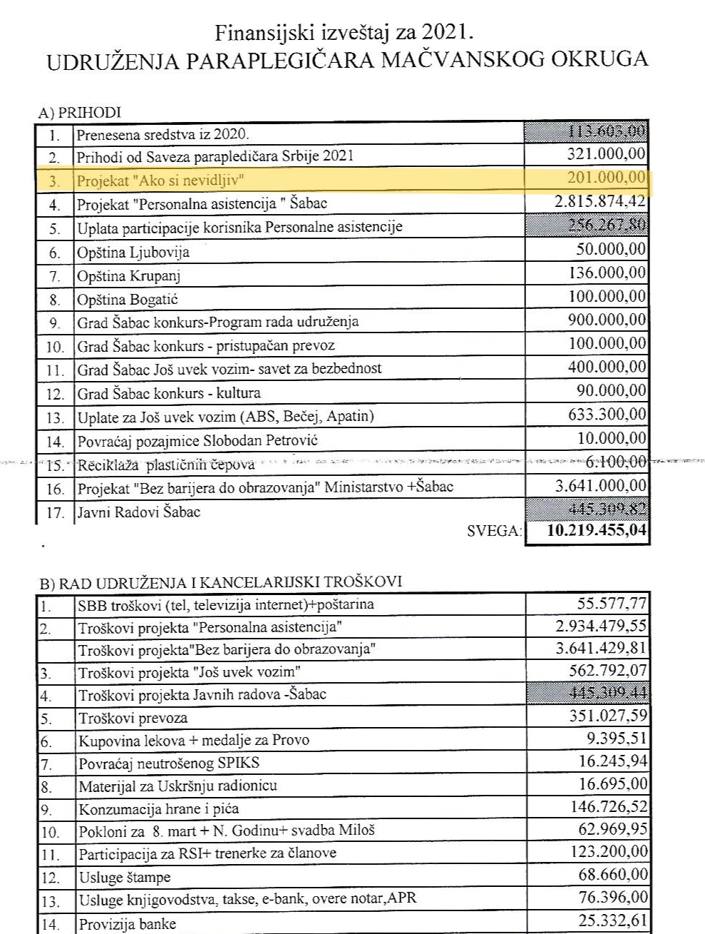Na godišnjoj Skupštini udruženja je za navedeni projekat u finansijskom izveštaju koji dobijaju svi članovi, sekretar Slaviša Savić je prijavio znatno manji iznos od dobijenog što se može videti na kopiji za ćlanove izveštaja.